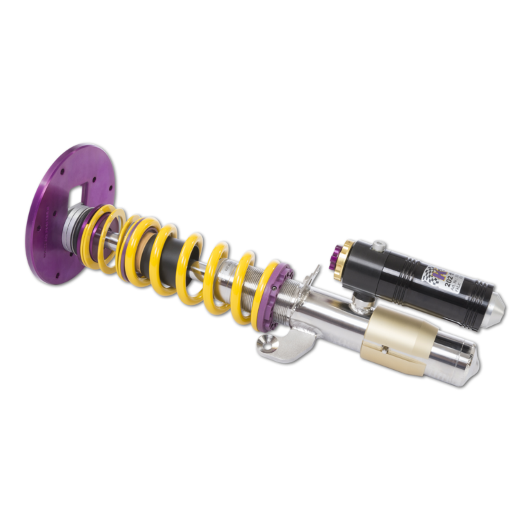 Das in zahlreichen Test- und Messfahrten auf der Nordschleife und dem KW 7-Post Fahrdynamikprüfstand entwickelte, fahrzeugspezifische Grundsetup des KW V4 Clubsport Gewindefahrwerks können Sie mit der Klickeinstellung weiter für Ihre Radlasten, Fahrzeuggewicht und der geänderten Karosseriesteifigkeit etwa durch einen verschraubten Käfig, eingeschweißter Sicherheitszelle oder Domstreben anpassen.Wollen Sie das mit Teilegutachten erhältliche KW V4 Clubsport Gewindefahrwerk eventuell für Ihre Anreise zur Nordschleife oder anderen Rennstrecke für die Fahrt auf der Autobahn komfortabler abstimmen, reduzieren Sie einfach die Zugkräfte über die Zugstufendämpfung. Die beim KW V4 Clubsport Gewindefahrwerk genutzte Rennsporttechnologie des mehrfachen Gesamtsiegers des ADAC Zurich 24h-Rennen Nürburgring wird noch über Aluminium-Uniball-Stützlager unterstützt.